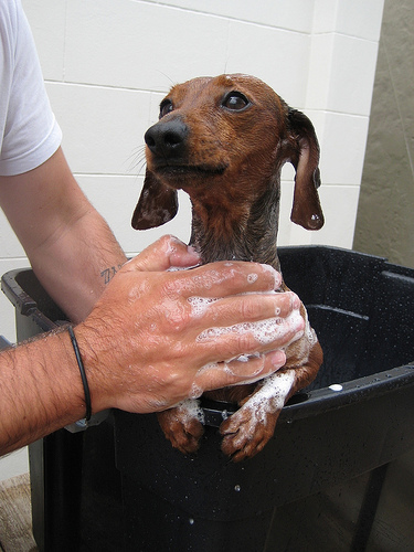 Spray– Many companies sell waterless shampoos. The shampoos work by spraying on the coat, rubbing it in and then wiping it off with a dry towel.