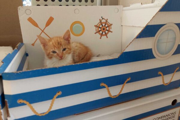 Cat cabins are cardboard box houses that act as a safe haven for cats in shelters. These unique cabins enable cats to express their natural behaviours, including perching, hiding and scent marking, making for happier and healthier cats. When a cat is adopted, the same “cat cabin” transforms into a temporary carrier for traveling home. Once home, adopters are encouraged to reassemble the cabin, as it has the cat’s scent on it and helps ease their transition into their new home by offering a familiar place to perch, sleep, hide and rub.