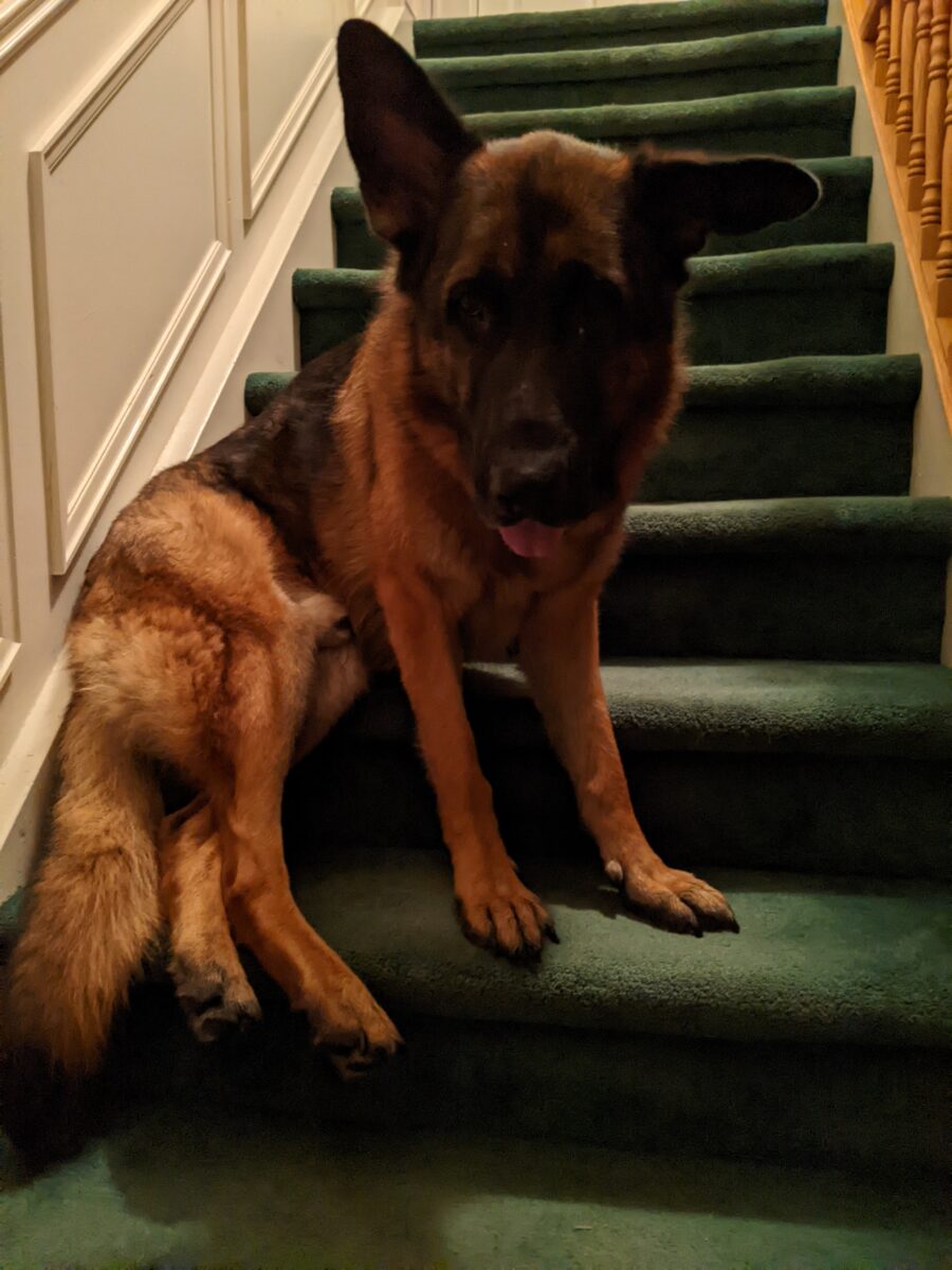 During this time, Alison was having conversations with staff about whether Vulcan would be a good fit for her family. Her family has had German Shepherds for years and she says they were now looking for an adult dog to bring into their home. She says Vulcan stole their hearts right away and they decided to bring him home as a foster-to-adopt.