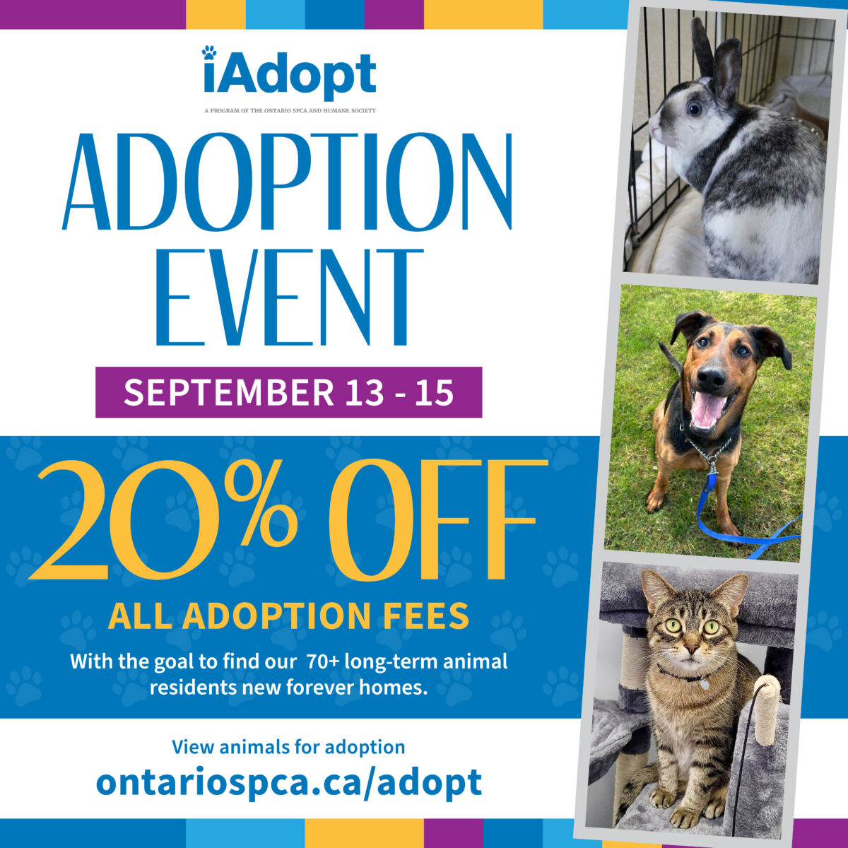 “We are seeing an increase in the number of animals coming into our care, and many of them are staying with us longer before getting adopted,” says Sonya Reichel, Vice President of Operations, Ontario SPCA and Humane Society. “We want to find loving homes for as many furry friends as possible during this adoption event so we can help even more animals.”